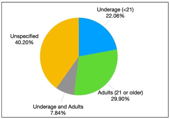 In terms of the age ranges of participants, we classified studies based on the minimum legal age of 21 to purchase of alcoholic beverages in the United States. Based on this, over one-fifth of the sample (n = 45, 22.06%) recruited participants below the age of 21, 61 studies (29.90%) recruited adult samples (over 21 years old), and 16 studies (7.84%) recruited samples of underage youth and adults. The remaining 82 studies (40.20%) did not indicate the age of participants, bearing in mind that some of these studies are non-human subjects studies, χ2(3) = 45.53, p < 0.001 (see Figure 7). Roughly six of 10 of the reviewed studies (n = 117, 57.35%) included a reference in the method section related to the sample’s gender distribution, χ2(1) = 4.41, p = 0.04.
