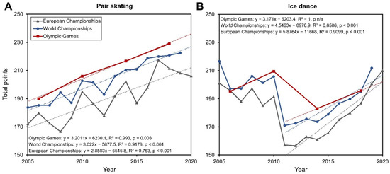 Trends of the average total points of the best five pairs in pair skating (A) and ice dance (B) at the European and World Figure Skating Championships, and the Olympic Games since 2005. Linear regression analysis was performed to show trends over time in pair skating (2005–2020) and ice dance (2011–2020). Regression functions, coefficients of determination (R2) and p values (ANOVA, dependent variable: average total points of the best five pairs, independent variable: year) are shown for each group. In ice dance, a drop in total points followed a change in regulations in 2010. Note the performance peaks in pair skating at the European Championships in years with Winter Olympics.