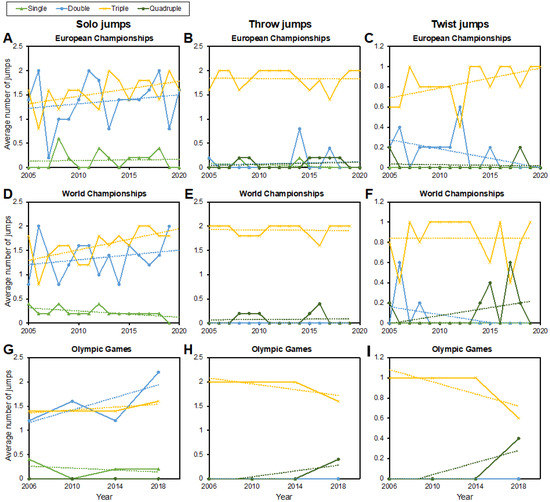 Figure 2 displays trends of the average number of jumps of the best five pairs in pair skating separated by solo jumps, throw jumps and twist jumps. The associated regression statistics are shown in Table 1. Significant increases were found in the double and triple twist jumps at the European Championships but not at the World Championships or the Olympics. At the World Championships, the number of single solo jumps decreased significantly in favor of triple jumps, which increased significantly, without a similar effect at the European Championships or Olympics.