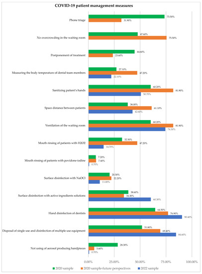 At the beginning of the pandemic, the COVID-19 management measures for dental patients were considered a crucial means of stopping the disease from spreading within the dental practice. Dentists mostly considered that these preventive measures had to be implemented in a more intensive manner in the (near) future, even more than they did at the beginning of the pandemic. After the implementation of the survey in 2022, it was clearer that 2020 perspectives were set mostly higher and that some of them were even abandoned nowadays. Nevertheless, the implementation of these measures in the 2022 sample was still higher than at the beginning of the pandemic (Figure 2). In the 2022 study sample, there was a significant number of surveyed participants (41.90%) who also have taken part in the survey in 2020. However, their answers have not been statistically different at all regarding their current attitudes about the implementation of prescribed preventive measures compared to other participants from the 2022 sample. However, statistically significant differences which were determined within the 2020 sample and between the 2020 and 2022 samples are shown in Table 5.