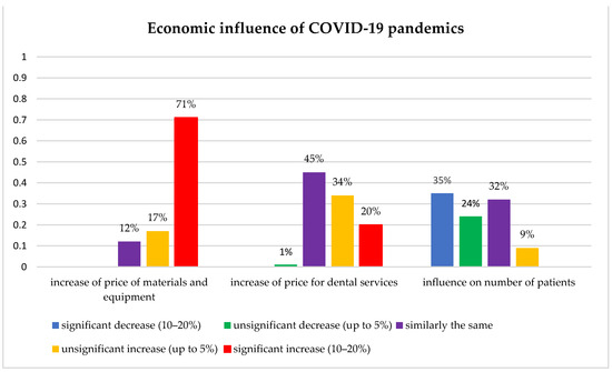 Figure 4 showed that the economic influences of the COVID-19 pandemic inevitably targeted also dental practice and patients, in the way of significantly increasing costs of dental materials and equipment and dental services as well. Subsequent lack of assets in dental patients additionally caused a significant decrease in dental visits.