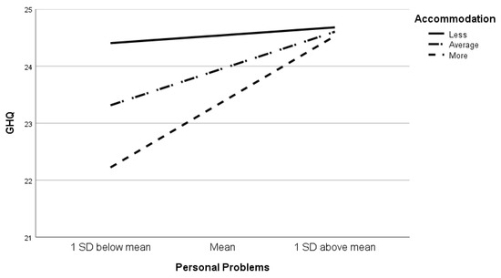 Slope graph testing the interaction between accommodation and personal problems on psychological well-being (GHQ).