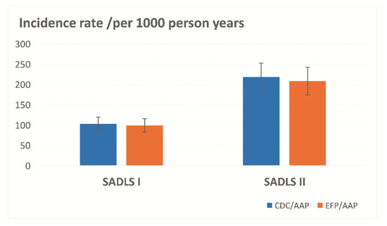 Figure 1 depicts the rate of chronic periodontitis (incidence + progression) among Australian older adults across the 22-year study period. A similar trend was observed under the AAP/CDC and EFP/AAP case definitions: the incidence rate was highest in SADLS II (more than 210/per 1000 person-year) than in SADLS I (approximately 100/per 1000 person-year).