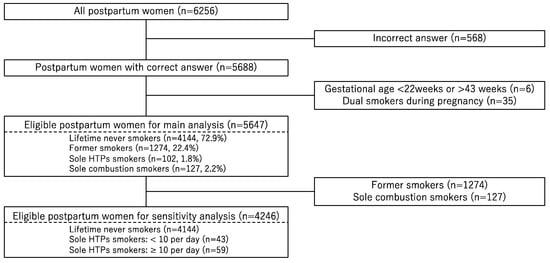 This nationwide, cross-sectional study used data from an internet-based survey conducted as a part of the Japan COVID-19 and Society Internet Survey []. The data from the participants for each survey were retrieved from the pooled panels of an internet research agency []. First, a screening survey was conducted on 24 July 2021 to determine the eligibility of participants who had singleton births after July 2019, and 11,661 participants were determined to be eligible for this study. Next, the internet research agency distributed a questionnaire to all eligible post-delivery women through an e-mail with a link to a designated website. Data on current pregnancies were collected from 6256 women (response rate, 53.6%) between 28 July 2021 and 30 August 2021. First, we excluded 574 women who provided irrelevant or contradictory information and had inappropriate gestational weeks at delivery (<22 or >43 weeks). The definition was in accordance with the methods performed in previous studies by the same research group []. Second, to focus on the effect of HTPs, we excluded 35 women who smoked both HTPs and combustion cigarettes during pregnancy. Finally, 5647 women were eligible for our analysis. The prefectures where the selected post-delivery women lived were representative of all the prefectures in Japan (Table S1).
