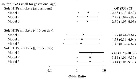 Odds ratios of current sole HTP smokers (any amount, <10 per day, and ≥10 per day) for SGA compared with never-smokers. CI, confidence interval; HTPs, heated tobacco products; OR, odds ratio; SGA, small for gestational age.