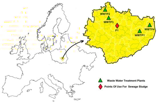 Sludge samples were collected from four different wastewater treatment plants located in the Swietokrzyskie province in Poland (Figure 1). The characteristics of the treatment plants are presented in Table 2. The plants differ in the type of sludge treatment, which are: oxygen stabilization, dewatering on belt press, Imhoff fermentation, and internal digester fermentation. Reference points for the content of heavy metals in soil were measuring stations prepared within the Framework of Monitoring of Chemistry of Arable Soils in Poland [] located not far from the sampling points (Figure 1). Test Point 361 in Wola Kopcowa was selected as a point for potential use of sewage sludge. The soil was characterized by complex 2z (medium grassland), type: A (podzolic soil), and valuation class: IVb. The soil type was sandy loam. The “pH” in H2O suspension was 5.5, while in KCL, it was 4.5. The humus content of the soil was 3.24%, organic carbon 1.88%, total nitrogen 0.09%, while the C/N ratio was 20.89 [].