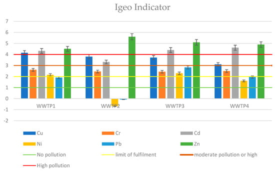 The Igeo index is largely dependent on the heavy metal content of the soil at the site of potential use. Because of this fact, a common site for sludge from all four WWTPs was chosen as a potential sludge use point. Figure 2 shows the Igeo value for all samples analyzed
