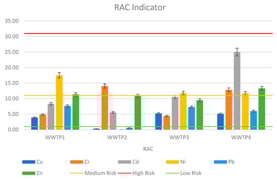 For all analyzed cases of sewage sludge, the RAC showed no high risk of environmental contamination. This is due to the low content of heavy metals in the FI fraction. Statistically, sediments collected from WWTP4 have the highest percentage of metals in the FI fraction. The highest percentage was recorded for cadmium from WWTP4, which was 25%, but it did not reach the high-risk level. The outcomes can be considered satisfactory; however, it should be noted that the RAC index only considers the FI fraction, ignoring the heavy metals in the FII and FIII fractions. Figure 3 shows the RAC value for all sewage sludge samples.