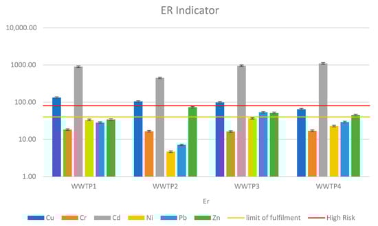 The ERD index revealed similar risk levels to the RAC, but it was more accurate due to the inclusion of metals from fractions II and III. As with the RAC, sewage sludge collected from Wastewater Treatment Plant 4 proved to be the most hazardous in terms of potential metal migration. Figure 5 depicts the ERD values.