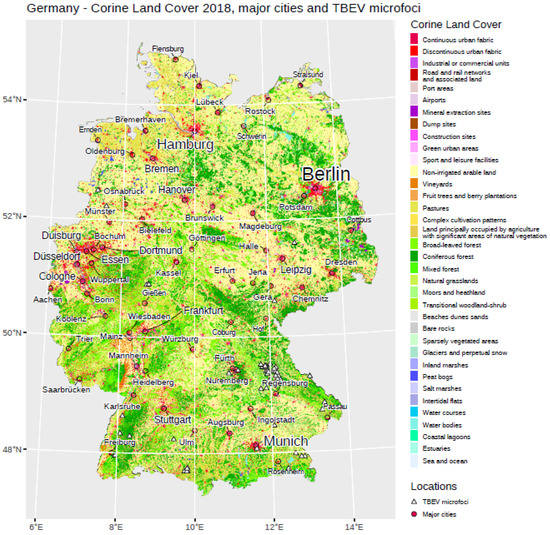 General overview regarding different land cover classes in Germany. Major cities are displayed, as well as the location of TBEV microfoci used in our analysis.