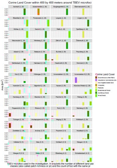 Overview regarding TBEV microfoci and the surrounding land cover classes within 400 × 400 m.