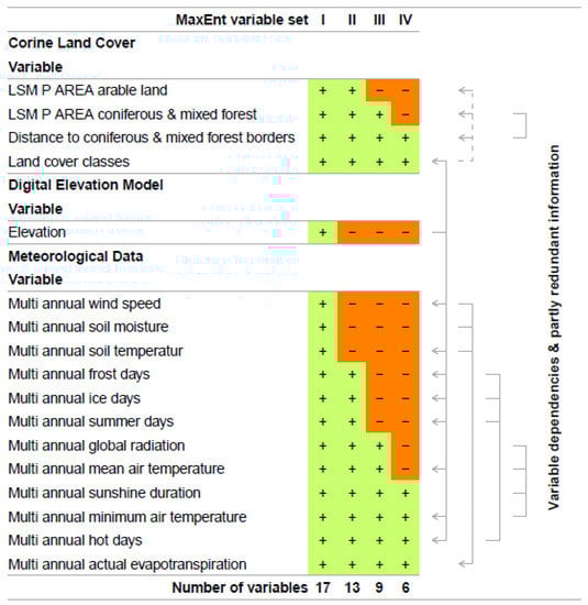 Figure 3 lists those variables that passed Fisher’s Exact Test (MaxEnt variable set I). In an iterative process of reducing variable dependency and partly redundant information (MaxEnt variable set II-IV), we identified the most relevant variables for the prediction of TBEV presence. This includes the MaxEnt analysis of variable contributions, Jackknife test for variable importance, and a literature driven review of redundancy. Variable contributions were estimated as variable contributions to the model in percent and as permutation importance, where the model was reevaluated based on randomly permuted variables. Additionally, we estimated variable importance by performing a Jackknife test. Here, each variable was individually excluded from the overall model and additionally, a model with only the excluded variable was created. Therefore, the Jackknife test estimated the explanatory power of the overall model if variables were not included, as well as which variables held the highest information by themselves. This, in turn, means that variables could be dropped from the model if their contribution to the overall model was subordinate. As some of the environmental data were highly correlated (e.g., frost days and ice days), this information also influenced the decision regarding which variables were excluded from the model.