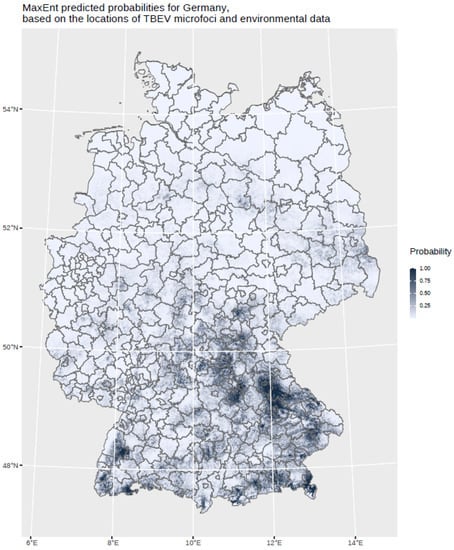 It is of great scientific importance to understand zoonotic infections and to identify the core environmental factors maintaining the zoonotic cycles of the pathogens in the biocenosis and in the transmission to humans. We introduce a MaxEnt model for the detection of TBEV microfoci in Germany. The machine-learning-based approach, called maximum entropy modeling, allowed for the calculation of a probability distribution resulting in a fine-grained prediction map (400 × 400 m). This spatial resolution approximates the biological concept of the microfoci embedded in larger natural foci very closely [,]. It is speculated that the microfocus size of approximately 1ha is defined by the presence of the vector, mainly Ixodes ricinus, the reservoir host, e.g., small rodents, and its biological operating range in such a habitat.
