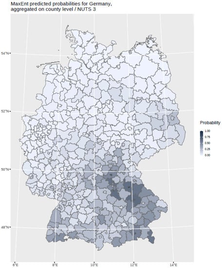 MaxEnt predicted probabilities for Germany aggregated on NUTS 3 level. The probability is displayed in different grey shades.