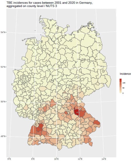 Infections due to TBEV became a notifiable disease in Germany in 2001. Case definitions are issued by the Robert Koch Institute (RKI). The German case definition differs from the definition issued by the European Centre for Disease Prevention and Control (ECDC). It includes febrile forms of TBEV infections without CNS symptoms. The reported number of TBEV infections has been open to access, available in different formats, as well as spatial and temporal resolutions, since 2001 at https://www.rki.de/DE/Content/Infekt/SurvStat/survstat_node.html, accessed on 1 June 2022. The data used span the years 2001–2020 and are aggregated on county/NUTS 3 level.