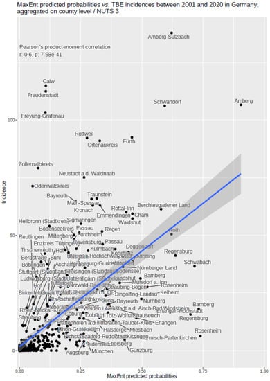 The notified incidence of TBEV infection between 2001–2020 aggregated on NUTS 3 level on the one hand, and predicted probabilities for the occurrence of TBEV in a 400 × 400 m grid by using MaxEnt, on the other hand, allowed for an additional evaluation of the MaxEnt results. This was done by aggregating the MaxEnt probabilities on the NUTS 3 level geometry and calculating the Pearson’s product–moment correlation coefficient between notified incidence and predicted probabilities based on the 401 NUTS 3 level objects for Germany.