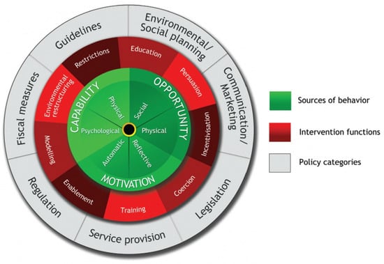 - Michie, S.; Atkins, L.; West, R. The Behaviour Change Wheel: A Guide to Designing Interventions; Michie, S., Atkins, L., West, R., Eds.; Silverback Publishing: London, UK, 2014; ISBN 978-1-291-84605-8. [Google Scholar]