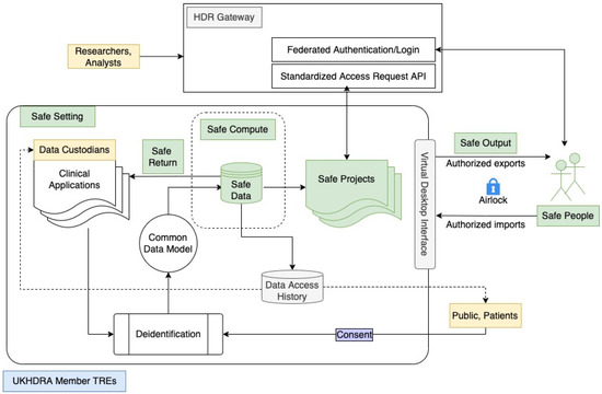 - UK Health Data Research Alliance and NHSX. Building Trusted Research Environments—Principles and Best Practices; Towards TRE Ecosystems (1.0); Zenodo: Geneva, Switzerland, 2021. [Google Scholar] [CrossRef]