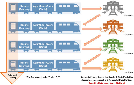 Pioneered by a network of public and private health, healthcare and biomedical research stakeholders from mainland Europe (mainly in the Netherlands and Germany), PHTs were conceived to enable healthcare professionals and researchers to work with, and combine, health data from distributed sources or institutions (‘data stations’), providing them with responsible data access for distributed analytics while addressing the privacy protection concerns and needs of data owners, including individual patients and citizens. Privacy protection is imperative to earning and maintaining data owners and the public’s trust in medical and health research and ensuring their continuing engagement and contribution of vital data. PHT data stations adopt the FAIR principles, FAIR being an acronym referring to ‘Findable, Accessible, Interoperable and Reusable’ data that are amenable to concerted analyses. The PHT ‘train’ metaphor is used to illustrate the concept of federated (decentralised) data analysis. The essence of the PHT approach is that the research question (train) travels to the data (in FAIR data stations) rather than data from various sources having to be transported to the research question [8,41,42,43,44] (Figure 2).
