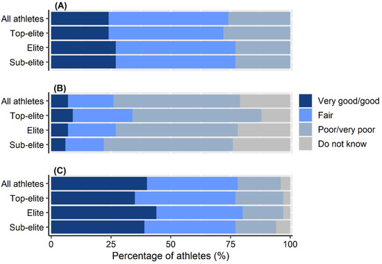 Athletes’ own perceived knowledge about aspects of female athlete health that might influence athletic performance (A), their coach’s knowledge in this area (B) and whether this subject was taboo in the athletic community (C) across athlete level. For “C”, the ordinal scale “Strongly agree/agree”, “Partly agree”, “Disagree/strongly disagree”, “Do not know” was used in descending order.