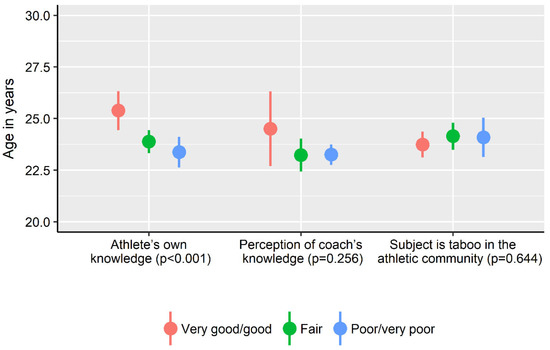 Forty percent of the athletes (n = 433) strongly agreed or agreed that female athlete health is considered a taboo topic in sports (Figure 2). There were no differences across athlete level of athlete knowledge about female athlete health (p = 0.171), athlete perception of their coach’s knowledge (p = 0.203) or the proportion of athletes that considered female athlete health to be a taboo topic (p = 0.434) (Figure 2). Athletes who considered their own knowledge as very good/good were significantly (p < 0.001) older compared to athletes that rated their knowledge as fair or poor (Figure 3), with small effect sizes for age-group differences (Cohen’s d 0.22–0.29). There was no difference (p > 0.05) in age between athletes that rated their knowledge as fair compared to poor, the proportion of athletes that perceived female athlete health to be a taboo topic and how the coach’s knowledge was viewed (Cohen’s d 0.01–0.20).