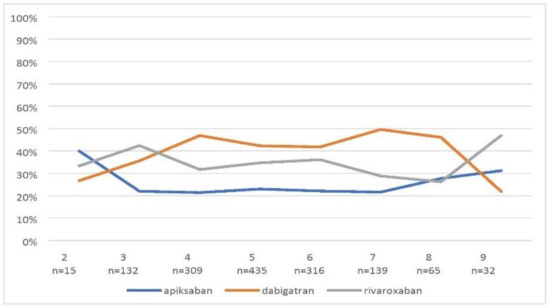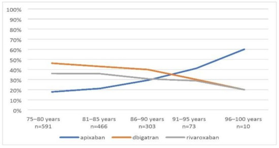 Among the oldest patients aged 96–100 years, apixaban accounted for 60% of prescribed NOACs, dabigatran 20%, rivaroxaban 20%. Among patients aged 75–80 years, the greatest number of patients received dabigatran—46.2%, and the lowest number of patients apixaban—17.8%. The distribution of individual NOACs in specific age groups is presented in Figure 2.