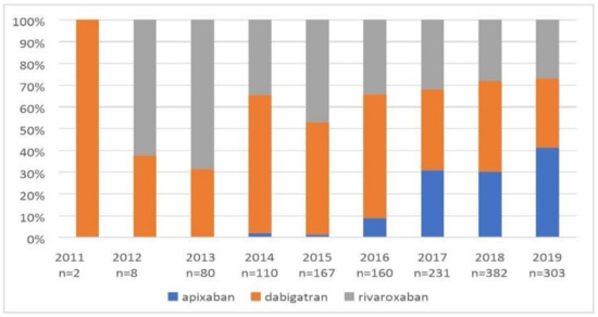 Temporal trends of anticoagulant therapy in all study patients treated with NOACs.