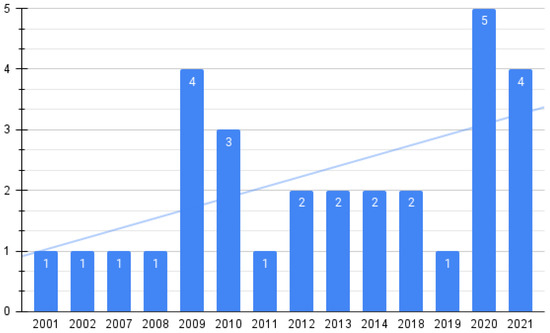 By publication year, in Figure 2 it is shown that the trend of studies reporting formats, standards, or even systems for format conversion to achieve interoperability in health information systems has been increasing since 2001.