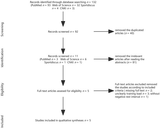 A total of 132 articles were initially identified, with 32 from the web of science, 93 from PubMed, 4 from SPORTDiscus, and 3 from CNKI. Then, 40 duplicates were removed, and 81 articles were excluded based on their titles and abstracts. After reviewing the full text, six articles were included for the review. Among the included studies, one tested peak power output, mean power output, peak bar velocity, and mean bar velocity to detect PAP [23]. The remaining four articles tested vertical jump [6,29,30,31,32]. The flow diagram is presented in Figure 1.