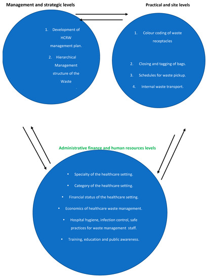 Figure 2 depicts numerous components that can be involved in efficiently dealing with HCRW. There are numerous levels at which HCRW should be explored. Among them are the management and strategic levels, practical and site levels, and administrative, financial, and human resource levels. All of the components can contribute to the development of an effective strategy for the better management of HCRW. It is suggested that they be mixed to produce the best outcomes.
