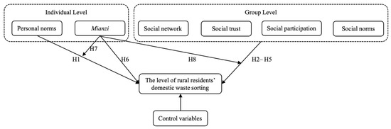 As shown in Figure 1, this study constructed a conceptual framework to represent the relationship between individual factors (personal norms, mianzi), group factors (social networking, social trust, social participation, and social norms), and the level of rural residents’ domestic waste-sorting based on the above empirical analysis.