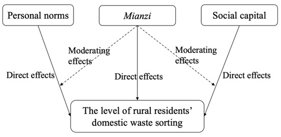 Mianzi, as an important mobilizing force for rural residents’ actions, can amplify their pride and guilt about whether they participate in pro-environmental public affairs [44]. The impact of mianzi on rural residents’ pro-environmental actions will reinforce a higher social capital in an acquaintance society structure. Rural residents with higher mianzi maybe attach importance to the role of social capital in regulating their pro-environmental behavior because they pay more attention to social resources and the relation network around them, whereas rural residents with lower mianzi maybe do not perform these actions because they are paying little attention to the reputation loss. It is reasonable to assume that the rural residents tend to be governed by mianzi when involved in domestic waste-sorting. The following hypotheses are proposed: