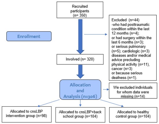 Overall, 350 participants (healthy and patients with cnsLBP) were recruited, and the cross-sectional survey was finally conducted with 306 participants in Baranya County (Hungary) between January and March 2019. Three groups were studied: (A) healthy participants, (B) cnsLBP patients participating in the back school program, and (C) cnsLBP patients participating in exercise therapy (Figure 1). The inclusion criteria for each group were (A) healthy participants: no history of LBP; no post-traumatic conditions within the last 12 months; no surgery within the last 6 months; for (B) cnsLBP patients in back school program: participation in a 12-week back school program and cnsLBP persisting for at least 3 months; and for (C) patients with cnsLBP syndrome in exercise therapy: cnsLBP patients who participated in 12 weeks of exercise therapy and cnsLBP persisting for at least 3 months as well. The inclusion criterion among all cohorts was age between 18 and 65 years. Exclusion criteria were body mass index (BMI) greater than 35, chronic pain syndrome, depression, non-Hungarian mother tongue, LBP with a non-spine origin (chronic pain syndromes, fibromyalgia, and psychosomatic pain symptoms), and other severe musculoskeletal, neurological, internal, and psychiatric diseases. Two physicians and two physiotherapists were involved. The specialists (a rheumatologist and a neurologist) carried out patient assessment and enrollment into the groups at the Institute of Physiotherapy and Sport Sciences of the University of Pécs. Convenience sampling was used. Elected patients were placed on a waiting list, and when the examined patient numbers reached 6–10, the BS program or exercise intervention began. The healthy participants were enrolled with snowball sampling. Surveys (after acquiring signed informed consent) were conducted in the first and last (12th) weeks.