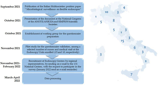 The survey was commissioned by SIMPIOS (Italian Multidisciplinary Society for the Prevention of Infections in Health Care Organizations) and ANOTE-ANIGEA (National Association of Operators of Endoscopic Techniques-National Association of Gastroenterology Nurses and Associates). In detail, a working group was created with members of both societies who prepared a specific questionnaire with 3 domains focusing on: (1) characteristics of the centre, devices used, and personal training; (2) the procedures followed for endoscopes reprocessing; and (3) the application of microbiological surveillance.