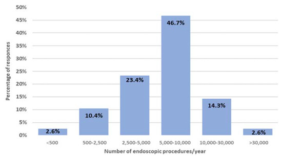 Percentage distribution of the annual endoscopic procedures performed in all 82 respondent endoscopic centers.