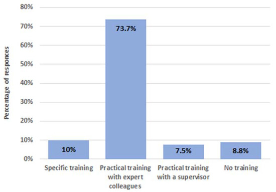 Regarding the question on specific training for reprocessing (80 replies), respondents stated that only a practical training with the supervision of expert colleagues or the coordinator was performed in 81% of centres. A specific theoretical training before practice was accomplished in 10% of hospitals, whilst 9% of respondents declared that no theoretical training nor formal supervision was completed by nurses performing reprocessing (Figure 3). Regarding professional update on the endoscope reprocessing, a formal retraining was estimated to be performed yearly in only 38% of centres.