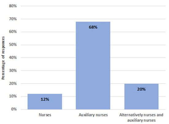 According to the 60 centres responding to these questions, the reprocessing of endoscopes was performed by dedicated staff in 40 (67%), nurses (12%) in endoscopy units, support personnel (auxiliary nurses) in 68%, and alternatively both figures in the other 20%. The other 20 centres reported that dedicated reprocessing staff was lacking, but operators alternate according to the shift and the department’s needs (Figure 4). While the precleaning procedure was estimated to be performed in 99% of units, the leak test was executed in only 58% of centres. For channel brushing, a single-use device was documented by respondents in 85% of structures. For high-level disinfection, the use of automated washer-disinfector machines was reported by all, but 1 centre where manual disinfection was still performed. Appropriate storage cabinets for reprocessed endoscopes were available in 60% of hospitals. Closed containers were never used.