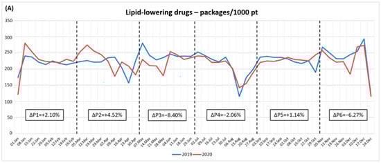 Overall, there was a small decrease in the number of dispensed packages, comparing the entire year of 2020 with the previous one, less marked for LL (−2.22%) than other therapies (AD: −5.40%; AH: −5.01%). However, in all the cohorts, a slight increase was observed in P2 (LL: +4.52% [Figure 1 panel A]; AD: +2.72% [Figure 1 panel B]; AH: +1.09% [Figure 1 panel C]), with a sharp decrease in P3 and P6 (LL: −8.40% and −6.27% [Figure 1 panel A]; AD: −12.09% and −9.71% [Figure 1 panel B]; AH: −10.54 and −9.04% [Figure 1 panel C]).