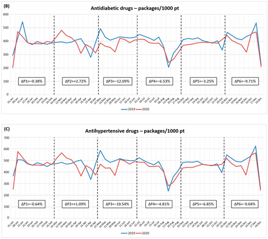 Fifty-two-week trends in chronic therapies dispensing in the population expressed as the number of dispensed packages per 1000 patients. (A) Lipid-lowering drugs. (B) Antidiabetic drugs. (C) Antihypertensive drugs.