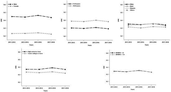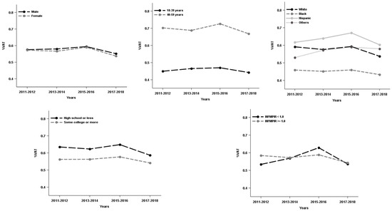 The study sample were approximately half females (48.6%), half middle age or older (49.0%, 40–59 years). About one third were minorities (38.8%) and had high school or less in education (34.8%), and less than one fifth of respondents (16.6%) had family income below the poverty level. Additionally, about one third of respondents were categorized as overweight (31.2%) and slightly more than one third as obese (37.4%). Males had higher VSR and VAA than females whereas females had higher subcutaneous fat area than males (see Table 1). Moreover, VAT%, VSR or VAA prevalence was varied by sex, age, race/ethnicity, education, and family income. Females, the younger group (18–39 years), Black, and people with higher education tended to have lower VAT%, VSR and VAA (see Table 2). Over the study period (2011–2018), VAT%, VSR and VAA increased for Hispanic and/or respondents who had family income below the poverty level up to 2016, and then decreased afterwards (see Figure 1, Figure 2 and Figure 3).