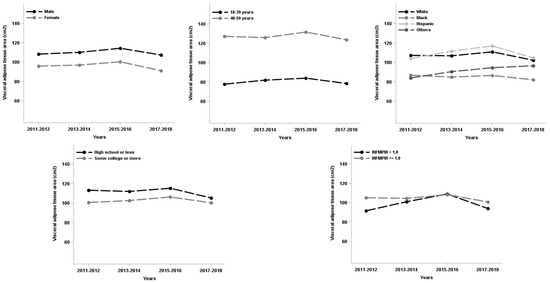 The overweight and obesity epidemic has long been a major health problem for US adults given the multitude of health risks associated with storing excess body fat [1]. However, recent research has emphasized regional body fat depots and distribution as an independent risk factor for many obesity-related illnesses [2,3,4,5,6,7,8,9,10,11,12,13,14,15]. More specifically, researchers have reported that visceral fat depots are associated with multiple chronic inflammatory diseases (e.g., type II diabetes, cardiovascular disease), metabolic syndrome, and all-cause mortality [4,5,6,7]. Additionally, studies also indicated that visceral adipose tissue area (VAA) and visceral to subcutaneous adipose area ratio (VSR) were also important for health [3,8,9,10,11,12,13,14,15]. Some research found the association between multiple metabolic risk factors and VAA [8,9,10] and VSR [3,11,13] that is independent of those seen with body mass index or overall body fat. Other researchers identified a connection between VSR and cardiovascular risks [14] or indicated that VSR was associated with type II diabetes [15]. These studies have concluded that visceral fat that is stored inside the abdominal cavity and around the internal organs carries with it much greater health risks than the subcutaneous fat that makes up most of the fat stored by the body [2,3,4,5,6,7,8,9,10,11,12,13,14,15]. All in all, abdominal fat-related measures: visceral fat, VAA and VSR have become variables of interest for better understanding the health risks of obesity-related illnesses [3,4,5,6,7,8,9,10,11,12,13,14,15]. Although the prevalence and trend (changes over time) of overweight or obesity in adults have been well documented [1], the trend of abdominal fat composition and distribution (e.g., VAA, VSR) is lacking especially using precisely measured visceral fat, VAA, and VSR. Since these abdominal fat measures are associated with cardiometabolic diseases [3,4,5,6,7,8,9,10,11,12,13,14,15], it is crucial to understand their changes over time in US adults. This will allow health practitioners to assess and evaluate nationwide abdominal fat progress and propose appropriate prevention and intervention strategies to address abdominal obesity to ameliorate its related chronic conditions and improve public health.