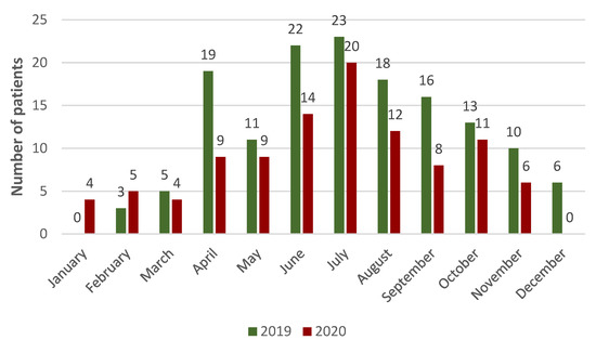 The study took into account the number of cases from 2019 (n = 9273; 53.15%) and 2020 (n = 8173; 46.85%). In 2019, there were 146 cases involving single-track vehicles, while in 2020 there were 102 cases (248 in total). A higher intensity of accidents with single-track vehicles was demonstrated in the summer period. A detailed list of interventions in the monthly schedule is presented in Figure 1. During the analyzed period, it was noted that 183 interventions concerned bicycle users (including e-bikes), which is 74% of the total, 61 concerned motorcycle users (25%), and the remaining 4 concerned scooters, including e-scooters (1%). PEMS syndromes were the most common for road incidents involving single-track vehicles, showing a significant correlation between PEMS vs. SEMS (chi-squared test = 59.645; p < 0.000). Taking into account the types of incidents in the analyzed period, 62 people were hit, 179 people fell, and 7 people became ill.