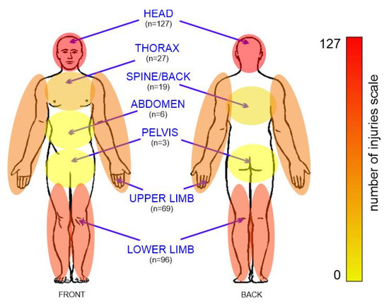 During incidents involving single-track vehicles, the head and limbs are the most vulnerable parts of the body to injuries. Figure 2 shows the different types of injuries in a general overview.