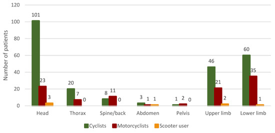 Among motorcyclists, injuries to the lower limbs (n = 35, 57.38%) were the dominant injuries, followed by head injuries (n = 23, 37.70%) and those of the upper limbs (n = 21, 34.42%). Scooter users most often suffered head injuries, as this type of injury was found in 75% (n = 3) of the injured. In second place were injuries of the upper limbs (n = 2.50%), while third place was taken by injuries of the lower limbs and abdomen (n = 1.25%).