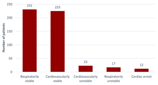 During the study period, the EMS teams assessed 225 patients as being circulatory-efficient (90.73%), while 23 were inefficient, constituting 9.27% of all of the victims. Efficient breathing was noted in 231 patients (93.15%), and in 17 patients breathing was marked as insufficient (6.85%). Sudden cardiac arrest (SCA) at the scenes of incidents occurred in 12 victims (4.83%), of which 4 withdrew from the medical emergency procedures due to prolonged resuscitation and signs of death. For two patients it was decided to call the Polish Medical Air Rescue (LPR) crew to help the EMS teams at the scene. Detailed datasets are presented in Figure 4.