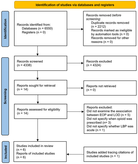 EOP within the first two weeks of LBP onset may be crucial in enabling individuals with acute LBP an earlier return to daily activities. However, adverse side effects such as drowsiness, cognitive impairment [23], addiction, and overdosing may place the individual at risk and delay recovery [24,25]. Clinical guidelines emphasize the avoidance of opioids in the management of acute LBP, with a focus on reassurance, staying active, and the use of non-steroidal anti-inflammatory drugs and acetaminophen if needed, with opioids reserved only for severe and unresponsive cases and only for several days [26,27,28]. Despite these recommendations, around 60% and 28% of cases presenting with LBP in ED and primary care are prescribed EOP, respectively [15,29]. EOP in acute LBP is associated with an increased LOD at two years of follow-up [17], a higher risk for surgery [17,30], and increased healthcare utilization (e.g., physiotherapy, imaging, hospital admission, and surgery) [30,31]. However, one study by Lee and colleagues demonstrated conflicting findings in which no statistically significant association was found between EOP and LOD in acute LBP [30]. To clarify and consolidate these conflicting findings, this study aims to undertake a systematic approach to review the literature, investigating the relationship between EOP and LOD in individuals with acute uncomplicated LBP.