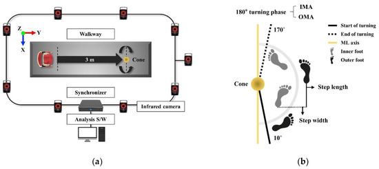 The 3D motion data were collected using nine infrared cameras (Vicon MX-T10, Oxford Metrics), the synchronizer (Giganet, Oxford Metrics), and the Vicon Nexus software (version 2.10.3, Oxford Metrics) (Figure 2a). For the global coordinate system, the position of the left posterior ground of the participant was set as the origin, and the positive X-axis, Y-axis, and Z-axis faced the right, anteriorly, and superiorly, respectively. In addition, the Z-axis was defined as the cross-product between the X-axis and Y-axis. The collected data were sampled at 100 Hz and filtered using a fourth-order Butterworth low-pass filter with a 10 Hz cutoff frequency [9,15].
