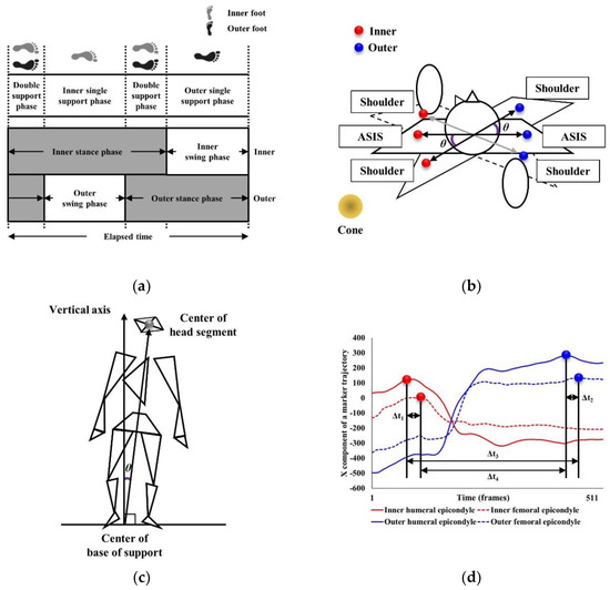 Analysis variables. (a) The definition of inner and outer double and single support and stance phases; (b) The definition of the maximum anti-phase; (c) The definition of the incline angle; (d) The definition of the inner and outer ipsilateral and contralateral temporal coordination parameters of the upper and lower limbs; ASIS, anterior superior iliac spine.