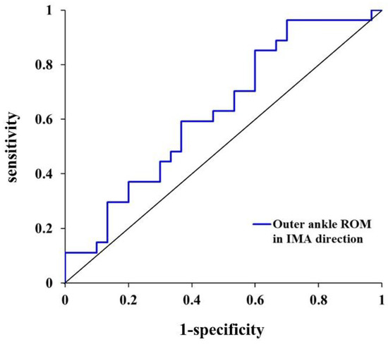 The results of the stepwise binary logistic regression and ROC curve analysis (Figure 4 and Table 3) showed that the variable that best distinguished freezers and non-freezers was the outer ankle ROM (cutoff value: 31.0°, AUC: 0.628, p = 0.026, sensitivity: 0.593, specificity: 0.600) in the IMA direction, and the explanatory power was 73.5% (RN2 = 0.735).
