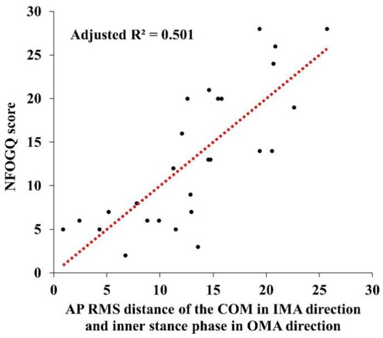 Y (NFOGQ score) = 160.710 + 61.272 X1 (AP RMS distance of the COM in the IMA direction) + 1.027 X2 (inner stance phase in the OMA direction)